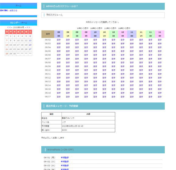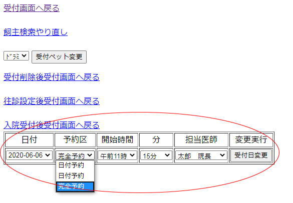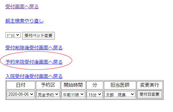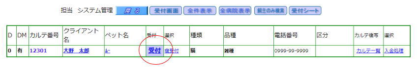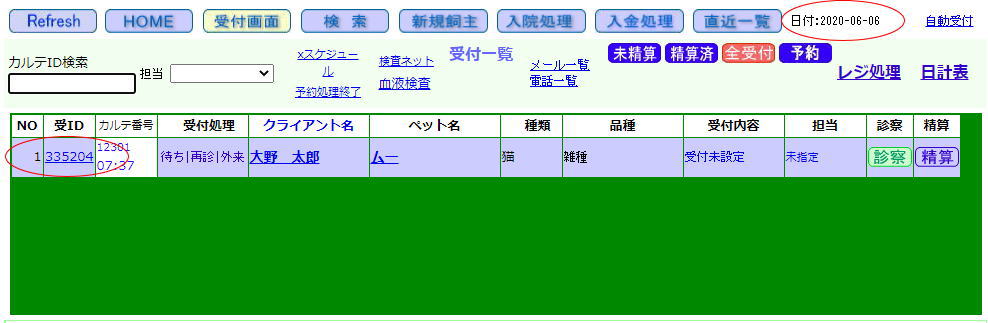通常の受付画面が予約日付として表示当該ペットが仮の受付状態で表示される。
